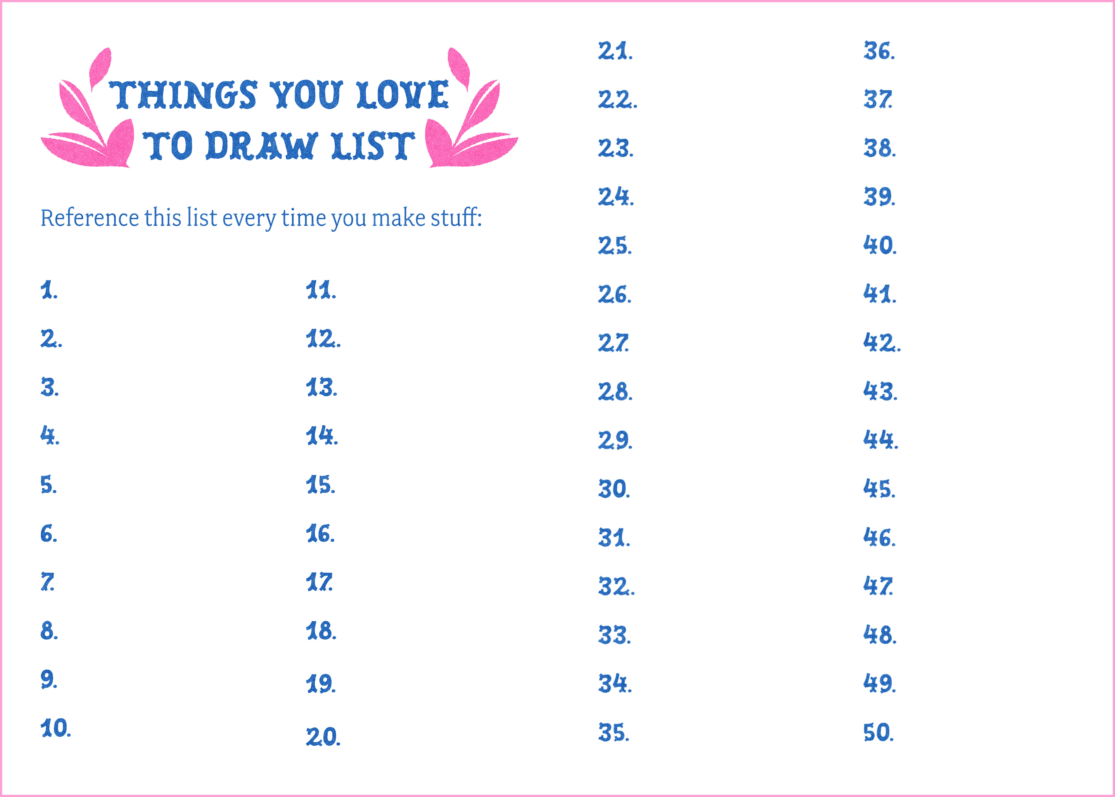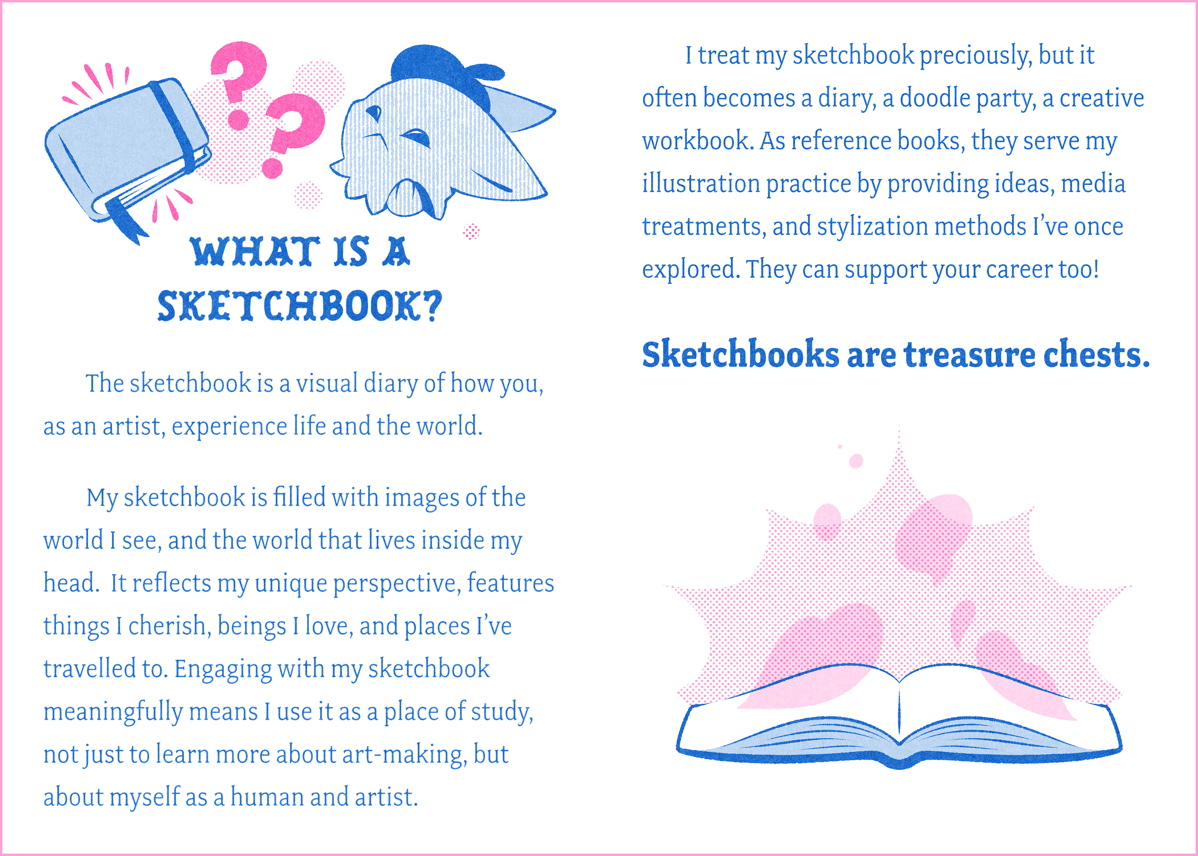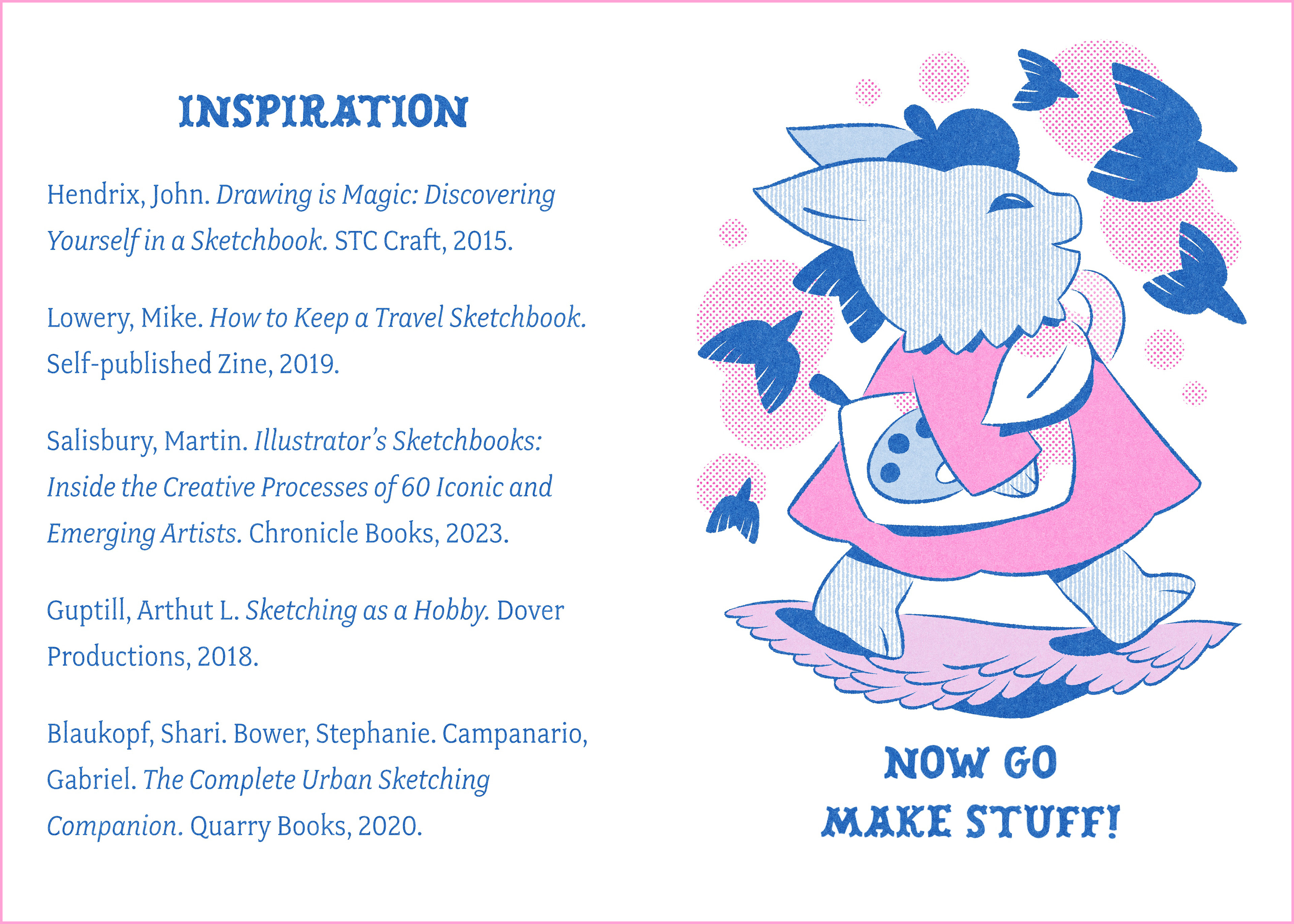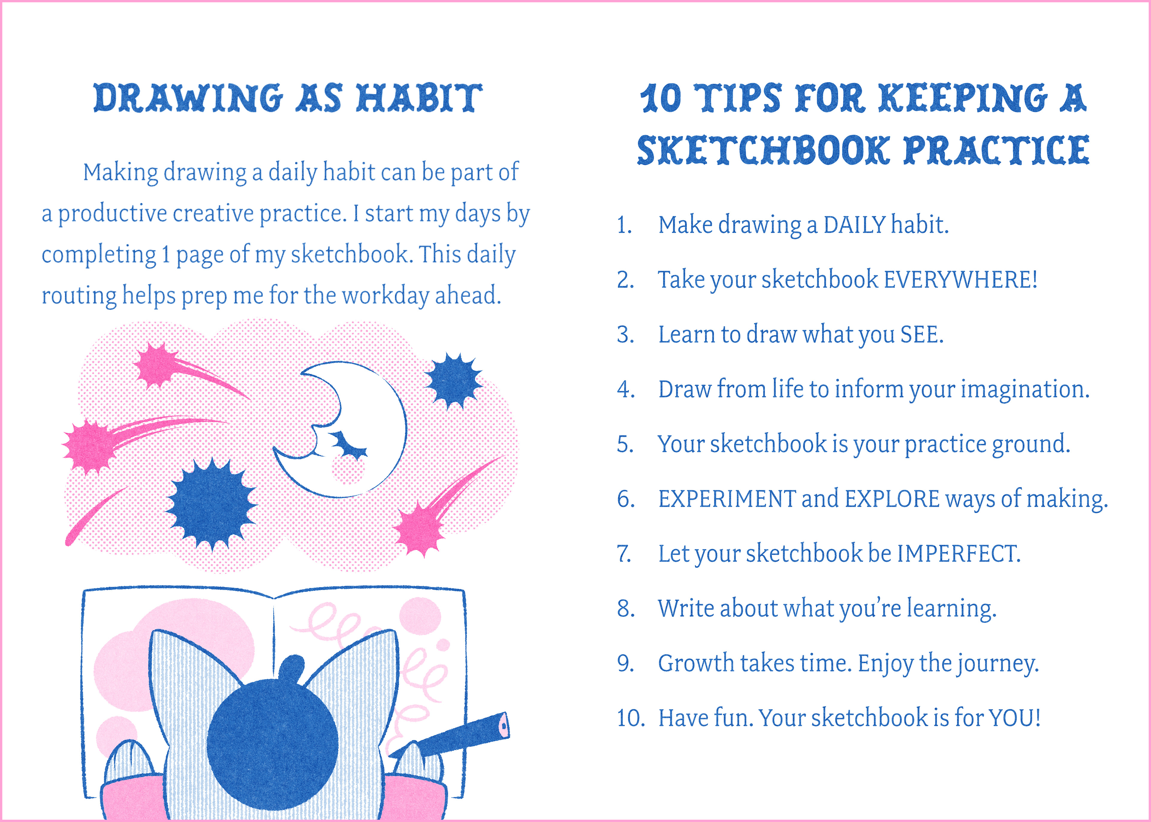 This zine is the perfect mini companion for those who wish to develop a sketchbook practice. It includes everything I have found useful for my own sketching practice. Published as a two-color risograph zine that is portable and user-friendly.